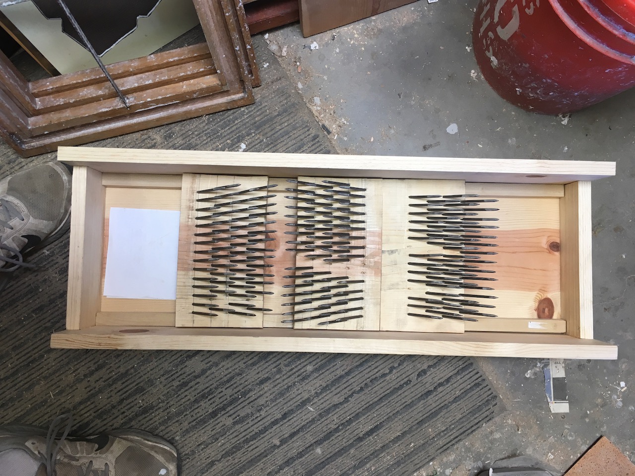First, raw cotton has dirt, seeds, sticks and other debris in it. Heck it is a natural material. In order to clean it and pull the locks apart a bit, I built a vicious looking device used by some spinners called a 'wool-picker'. The wool picker opens the wool and prepares it for carding, combing and even spinning. It's basically opposing boards filled with sharpened nails that catch and pull apart the wool (cotton in this case). Three boards on the bottom and a sliding board on top. Click here for really rough wool-picker plans.