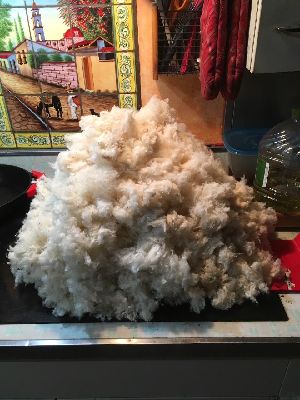 2). It took 2 days to scour 2.6 lbs. Change your water in all baths often, 'cause it can get the cotton kind of brown. If you change your water often, you won't get that. If you do, soak the material in 3 gallons of water with 2 cups 3% hydrogen-peroxide (H2O2). Note: It takes a while to dry the fiber. Sun and a fan helps the process along. I used my forced-air paper dryer to get everything dry.