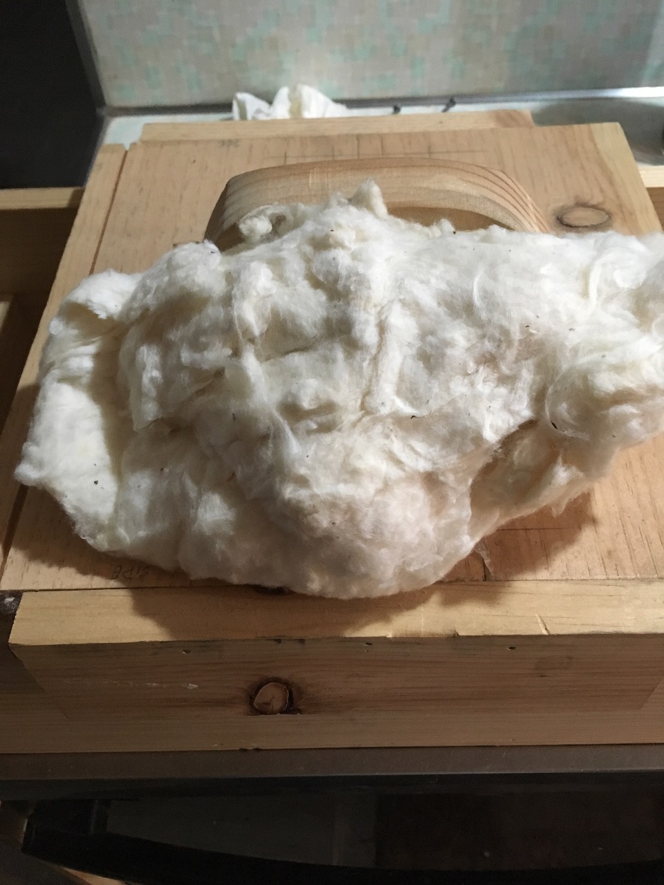 Click to enlargeTo use the picker, place the material at the open end (right side in the images) and place the top sliding board on top (of course) with the nails facing inward. As you slide the top board back and forth, it should drag the material (cotton in this case) into the picker and the inner nails will start to pull the material apart. By the time the material gets to the other end, it will be cleaner and more open. The dirt, seeds and other debris will fall to the bottom. You may have to do this a couple of times to really get the cotton opened up.